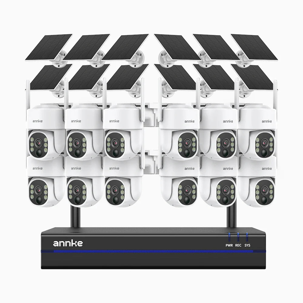 WBS400 - Zestaw do Monitoringu Bezprzewodowych 12 Kamery 4Mpx z 16-Kanałowy Rejestratorem NVR, podwójne pasmo WiFi 2,4/5,8 GHz Pro, detekcja ludzi AI, dwukierunkowy dźwięk, zasilanie bateryjne i solarne, obrót 270° i pochylenie 90°, kompatybilny z Alexa