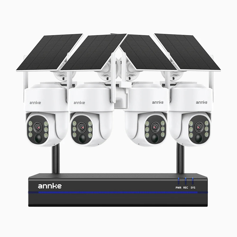 WBS400 - Zestaw do Monitoringu Bezprzewodowych 4 Kamery 4Mpx z 8-Kanałowy Rejestratorem NVR, podwójne pasmo WiFi 2,4/5,8 GHz Pro, detekcja ludzi AI, dwukierunkowy dźwięk, zasilanie bateryjne i solarne, obrót 270° i pochylenie 90°, kompatybilny z Alexa