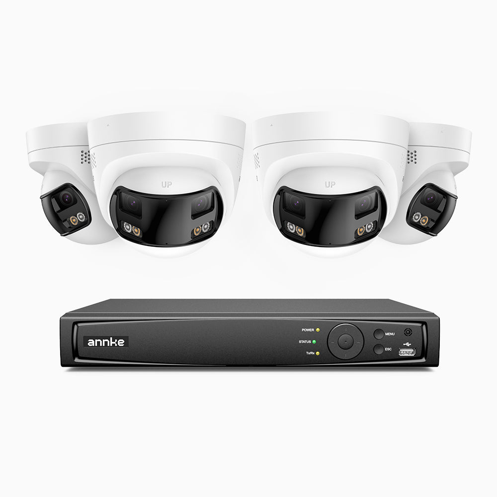 FDH800 - Zestaw do Monitoringu PoE 4 Kamery 8Mpx 4K z 8-Kanałowy Rejestratorem NVR, Podwójny obiektyw, panoramiczny widok 180°, inteligentne podwójne oświetlenie nocne, dwukierunkowy dźwięk, aktywna syrena i alarm, wykrywanie ludzi i pojazdów, IP67