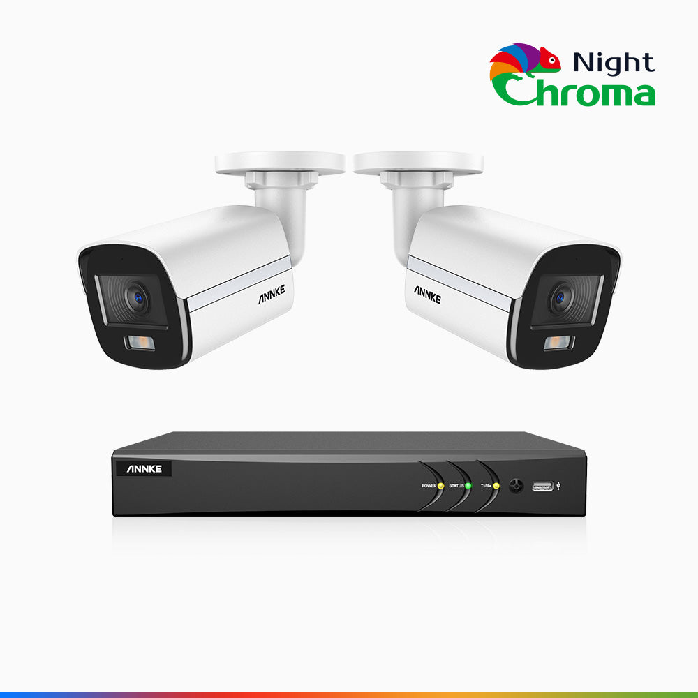 NightChromaTM NAK500 - Zestaw do Monitoringu 2 Przewodowa Kamery 3K z 8-Kanałowy Rejestratorem DVR, Noktowizja Pelny Kolor, 2960 × 1665 pikseli, Przysłona f/1.0 (0,001 Lux), Wbudowany Mikrofon, IP67, Zaktualizowana Wersja